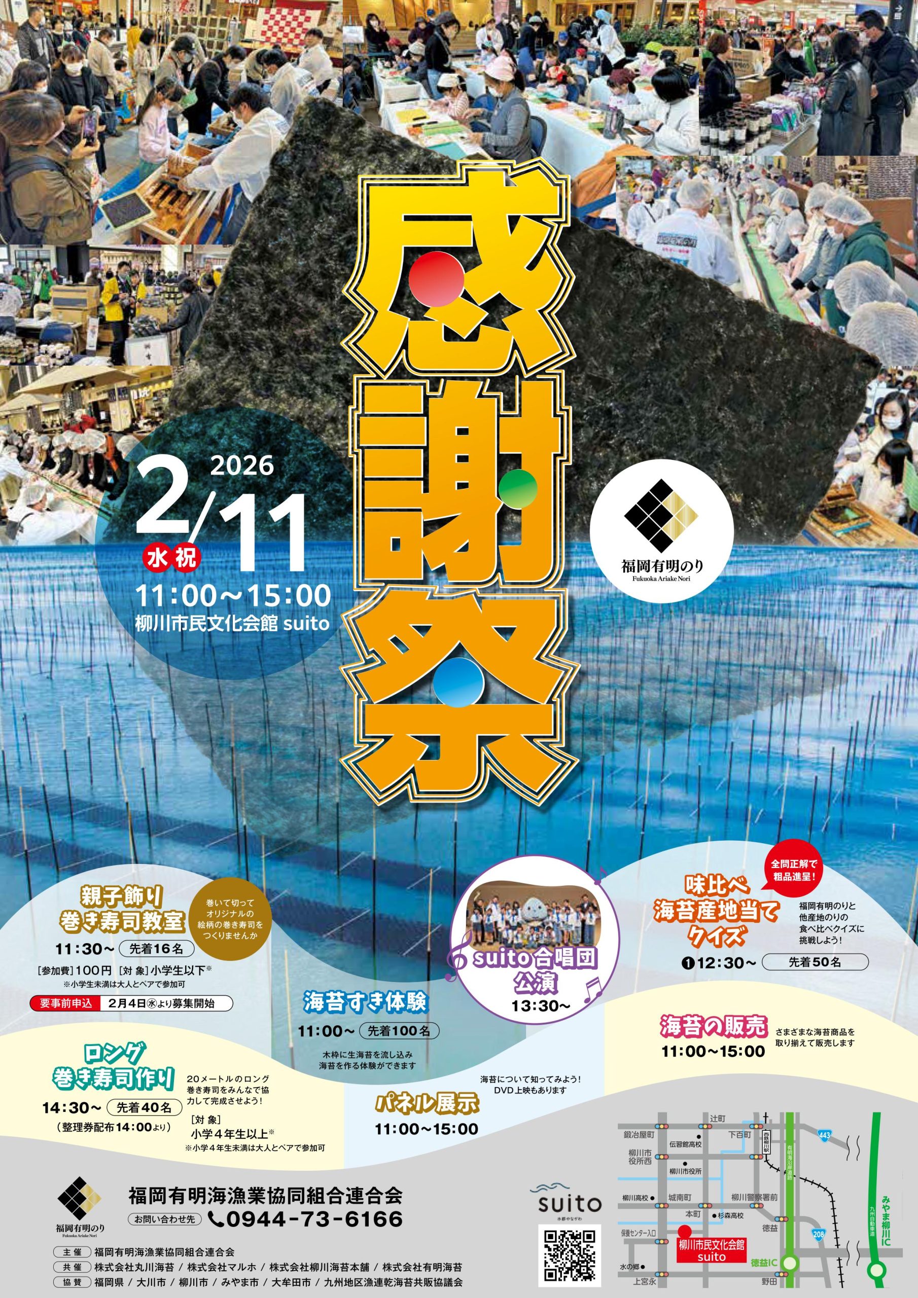 第9回福岡有明のり感謝祭を令和8年2月11日(水・祝日)11時から、今回は柳川市民文化会館suitoで開催いたします!